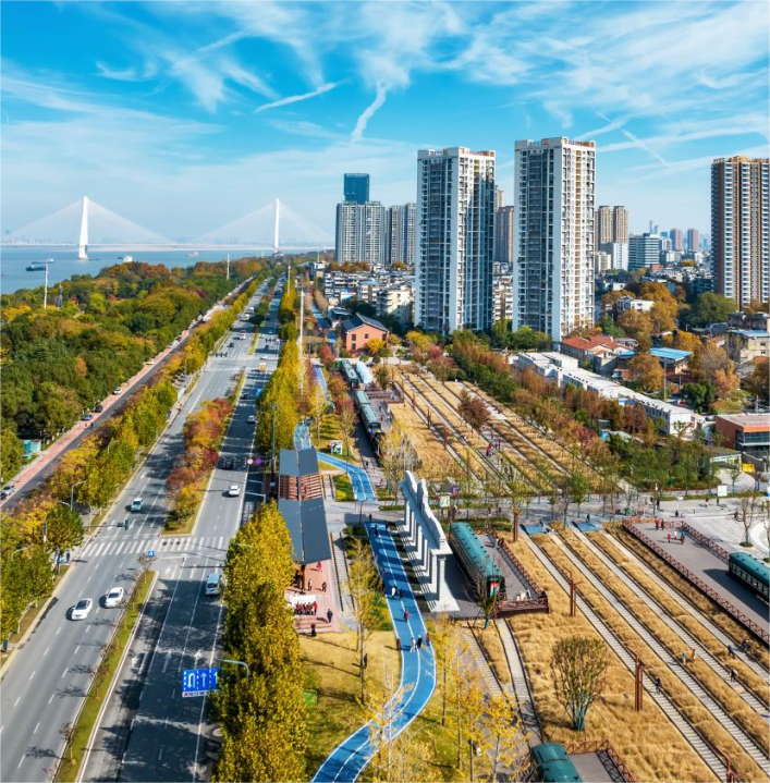 項(xiàng)目全線通過(guò)鐵路肌理與鐵路元素的保留、歷史建筑的改造、自然景觀的塑造等方式,搭建一條展示鐵路文明與園林生態(tài)交織的風(fēng)景線,融入武漢“百里沿江生態(tài)文化長(zhǎng)廊”,極大地提升長(zhǎng)江主軸城市功能及環(huán)境品質(zhì),成為展示武漢城市形象的重要窗口。